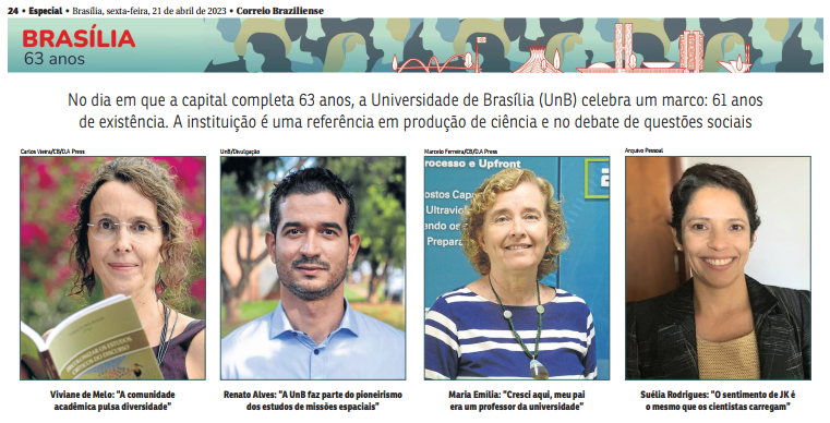 Já a professora Maria Emília Walter, decana de pesquisa e inovação da UnB, ressalta que o potencial cientí- fico da capital se reflete em todo o Distrito Federal. A relação da docente com Brasília passa pela vinda dos pais dela para cá, em 1958. “Nasci fora de Brasília, mas vim com duas semanas para cá, sou mais velha que a capital. Cresci aqui, meu pai era um professor da universidade e também engenheiro, então atuou em muitas obras na cidade, em particular na UnB. Estudei na Universidade de Brasília, fui aluna de graduação, depois de mestrado e fui fazer doutorado fora, porque, à época, não tinha a especialização em computação. Depois ajudei a criar o nosso doutorado. Meus filhos todos nasceram aqui. Brasília é uma cidade diferente das demais. Assim como meus pais, me sinto parte da constru- ção da capital”, relata Maria Emília.