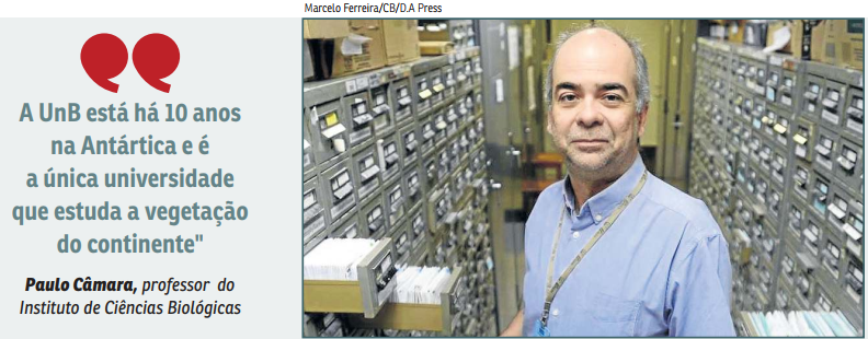 Desde criança, o professor Paulo Câmara, do Instituto de Ciências Biológicas, é fascinado por regiões polares e pela ciência de modo geral. Em 2013, ele começou pesquisas na Antártica — um ano após o incêndio que destruiu as instalações da base brasileira Estação Comandante Ferraz. Segundo o docente, a UnB foi a primeira universidade, fora do eixo Sudeste-Sul, que passou a ter projeto no continente gelado — o que mostra como Brasí- lia é um expoente na ciência. “A UnB está há 10 anos na Antártica e é a única universidade que estuda a vegeta- ção do continente. Nós não costumamos pensar que a Antártica tem plantas, mas tem. Eram 111 espécies e hoje são 116, descobrimos algumas por meio desse projeto com a UnB”, ressalta o professor.